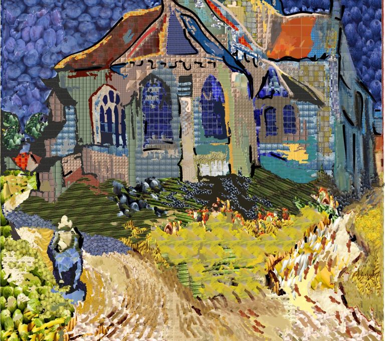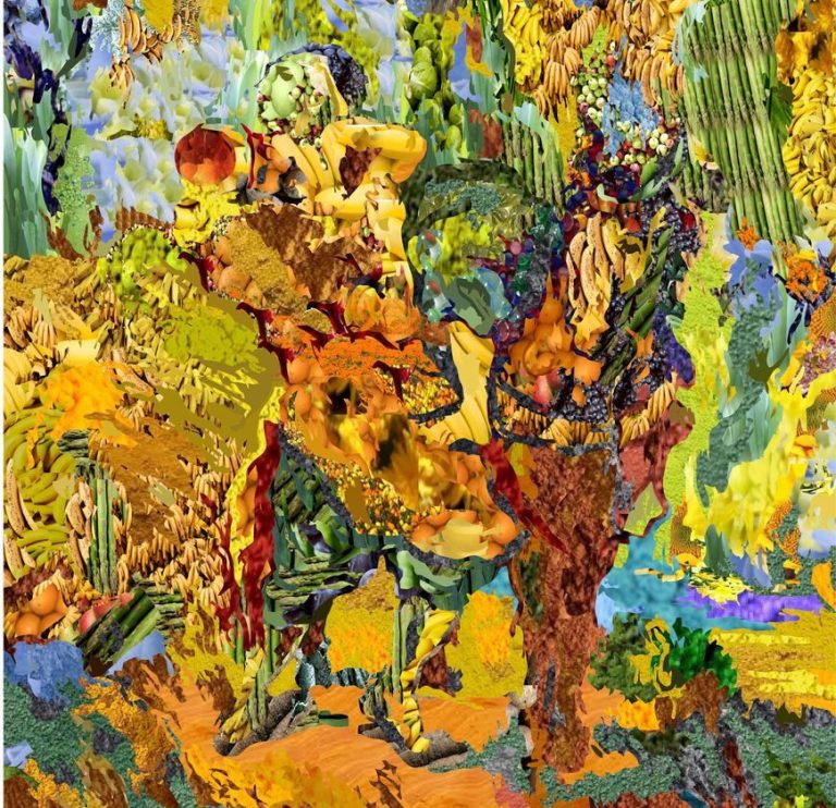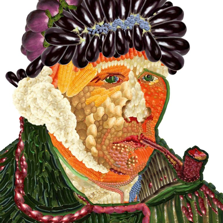 Replicas: Aus einer Vorlage mittels Coreldraw eine Vektorgrafik erstellt, mit Obst- und Gemüse Objekte nachgebildet.